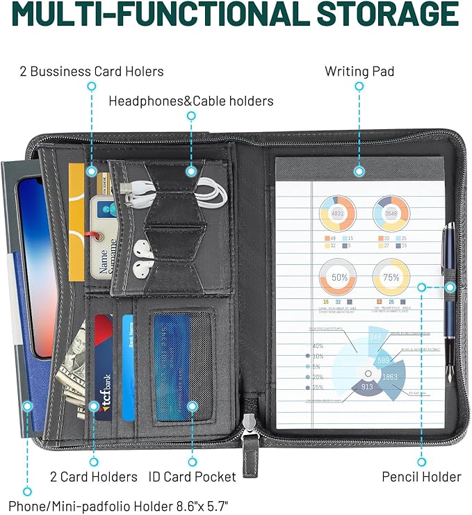 - SLEEK & PROFESSIONAL DESIGN:Designed to fit most briefcases and bags, this portfolio binder is perfect for professionals on the go. Features include:2 business card slots,1 pen holder,2 card holders,2 headphone cable slots,1 refillable writing pad slot (5.5" x 8.5"),1 tulle ID card pocket,1 mini padfolio pocket (5.5" x 8.5"),1 phone pocket (5" x 9"),1 legal pad notebook (4.8" x 7.9")