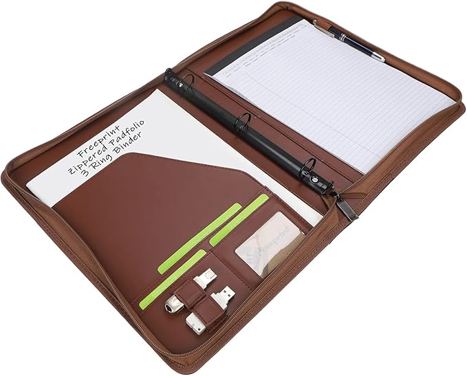 Zippered Portfolio 3 Ring Binder Organizer with Writing Pad Legal Size Letter - PU Leather Padfolio Document Organizer for Interview Business,Brown