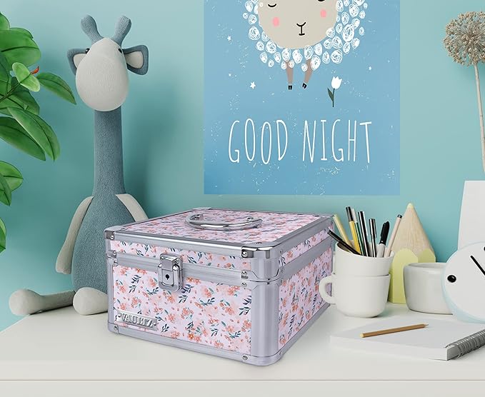 Vaultz Portable Safe Box - 10 x 10 x 6.5 Inch Large Storage Box with Lock, Mesh Pocket & Adjustable Compartments for Cash, Documents and Valuables - Floral