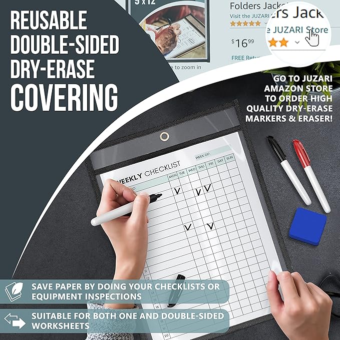 - [REUSABLE DRY ERASE SURFACE]: Save paper with these dry erase paper sleeves. Perfect as a dry erase document holder for classroom worksheets, checklists, or an order report. Just write, wipe clean, and reuse again and again for any task.