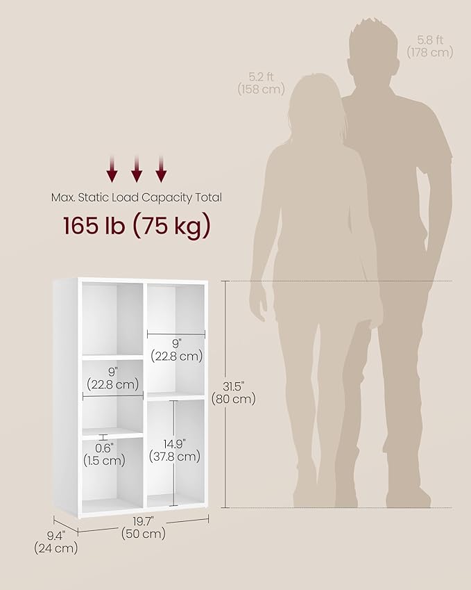 VASAGLE Bookcase, Bookshelf with 5 Compartments, Freestanding Shelves and Cube Organizer, Display Shelf for Small Spaces, for Living Room, Bedroom, and Home Office, Cloud White ULBC25WT