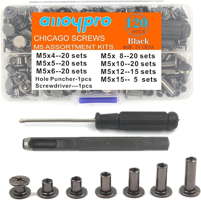 - 【Size and Colors】This package contains a total of 120 sets of Chicago screws in 7 different sizes, including 20 sets each of M5*4mm, M5*5mm, M5*6mm, M5*8mm, M5*10mm, and 15 sets M5*12mm, 5 sets M5*15mm. The round flat head of the screws has a diameter of 9.5mm.Color: Black.