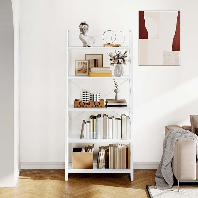 YITAHOME 5 Tiers Bookshelf, Modern White Bookcase, Book Holder Organizer, Display Storage Rack Standing Shelves for Bedroom Living Room/Home/Office, All White