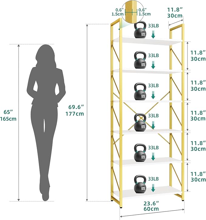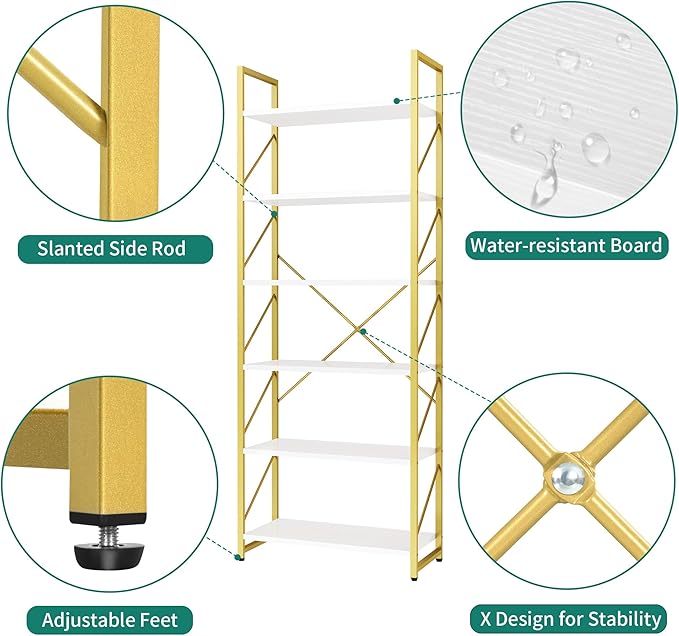 YITAHOME Tall Bookshelf 6 Tier Bookcase, Modern Gold Book Shelf, Open Display Storage Rack Shelves for Living Room/Bedroom/Home/Office/Kitchen, Holder Organizer for Books/Movies, White & Gold