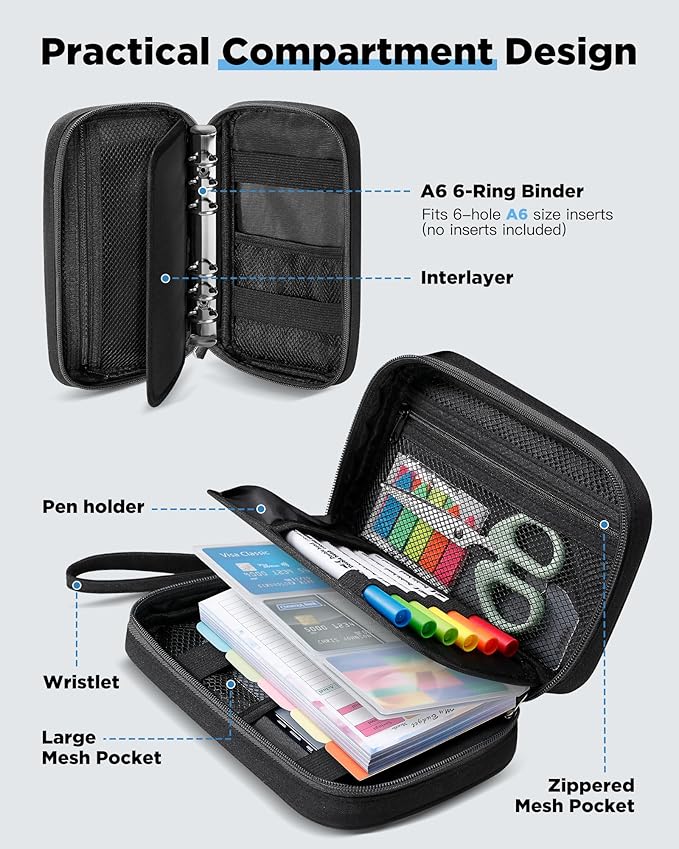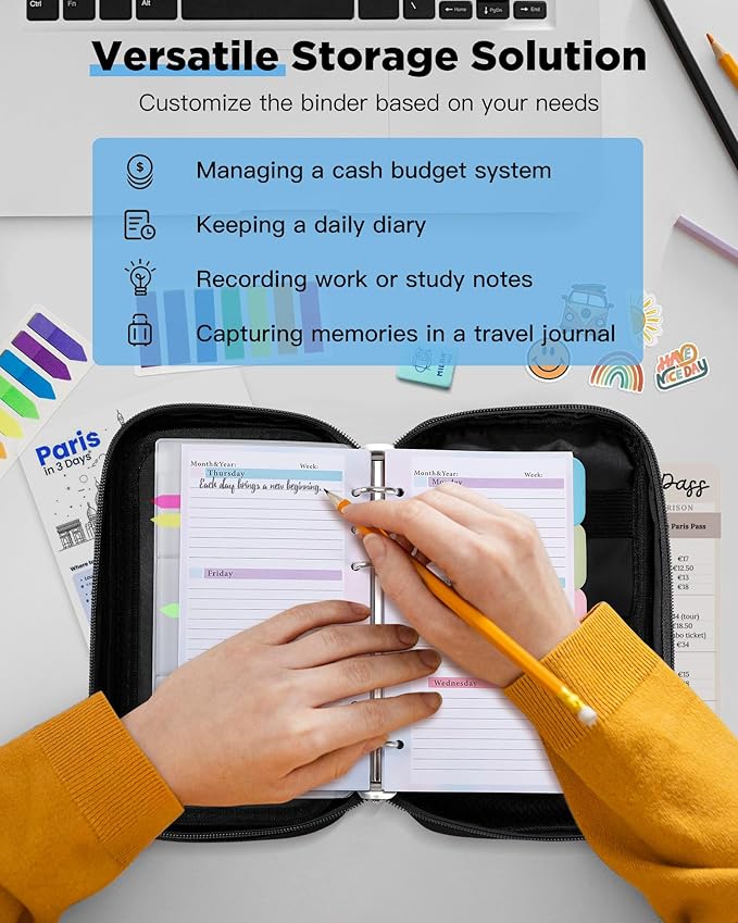 - Versatile Use for All Your Organizing Needs: Designed to accommodate A6 6-ring binder, this versatile binder case is perfect for a multitude of applications. Whether you're managing a cash budget system, keeping a daily diary, recording work or study notes, or capturing memories in a travel journal, this organizer has you covered. It's the ideal solution for anyone looking to streamline their home, office, or school organization.