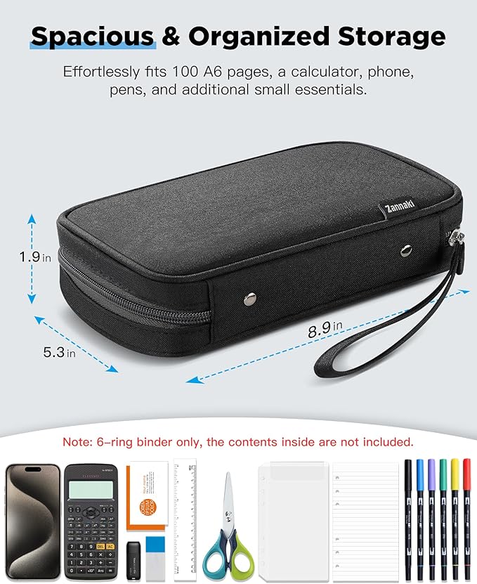 - Ample Storage for Everyday Essentials: With its generous dimensions and 0.79" wide binder rings, the Zannaki A6 Zipper Binder offers ample storage space, capable of holding up to 100 pages of A6 6-hole loose leaf papers, binder pockets, or other small items. This feature ensures that you have enough room to store all your daily essentials, making it easier than ever to keep your life organized and your items accessible.