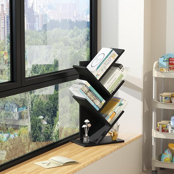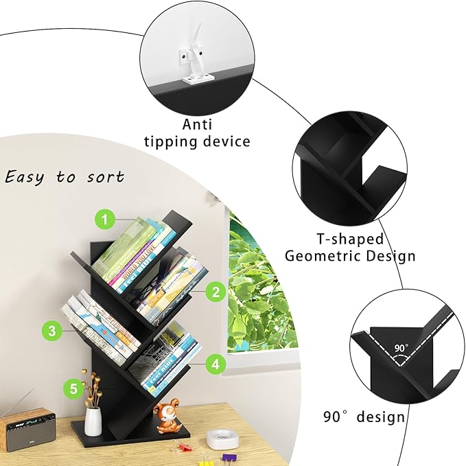 5 Tier Tree Book Shelf, Small Desktop Bookshelf with Storage Organizer, Wood Bookcase, Desk Display Bookshelves, Floor Standing Organizer Bookcases for Living Room,Bedroom,Office-Black
