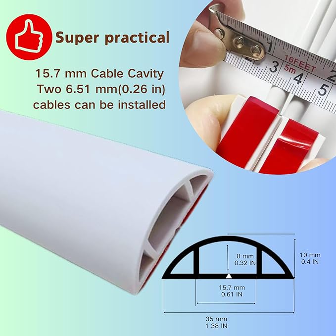 - [Self-adhesive Cable Protector with Spacious Channel] 10ft Length, 1.38" (W) x 0.40" (H), Inner Channel: 0.61" (W) x 0.32" (H). BEIEBIJOB floor cable cover can install multiple cables. Heavy-duty PVC construction can withstand foot traffic, rolling chairs, and vacuum cleaners. Note: The cable's diameter or height must be less than 0.32" (10mm) , Please measure the diameter of your cable before ordering.