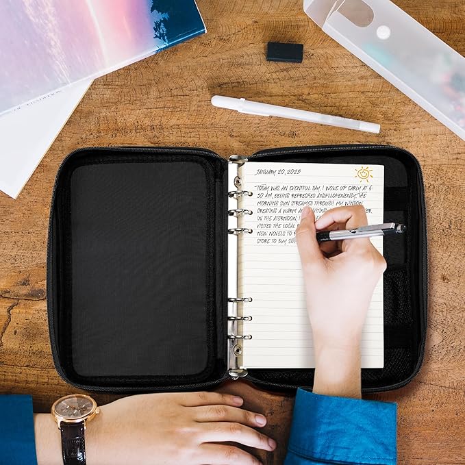 - Versatile Use for All Your Organizing Needs: Designed to accommodate A5 6-ring binder, this versatile binder case is perfect for a multitude of applications. Whether you're managing a cash budget system, keeping a daily diary, recording work or study notes, or capturing memories in a travel journal, this organizer has you covered. It's the ideal solution for anyone looking to streamline their home, office, or school organization.