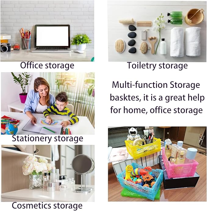 - 【Fashionable and vibrant colors】The color design of our storage crate is very unique, transparent and colorful, making the color looks very bright and fashionable. They are suitable for any scene. This set of mixed color storage crates includes four colors: clear yellow, clear green,clear pink, and clear blue, which can be matched to meet your preferences for different colors.