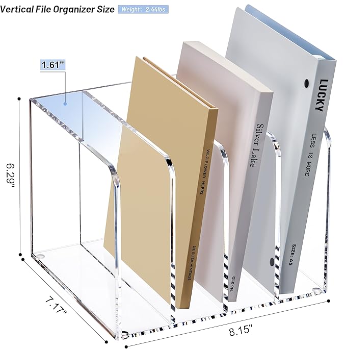- Clear Magazine Organizer:Dimension:8.15"D x 7.17"W x 6.29"H ,acrylic file organizer weights:2.44lbs.The acrylic book holder is transparent as a whole, making the files clearly visible and convenient to find. The acrylic file organizer is crystal clear and can match various home styles, adding a sense of refinement to your desktop space