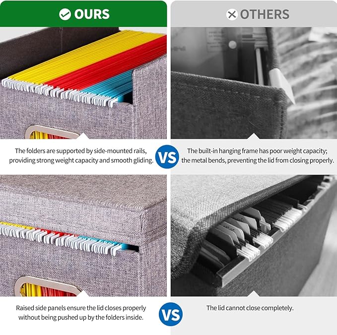 - Exclusive Lid-Friendly Design: Unlike standard file boxes, our unique raised-side design prevents file tabs from bending when the lid is closed. Features smooth PVC rails on front and back for effortless sliding, perfect for hanging file folders without damaging tabs