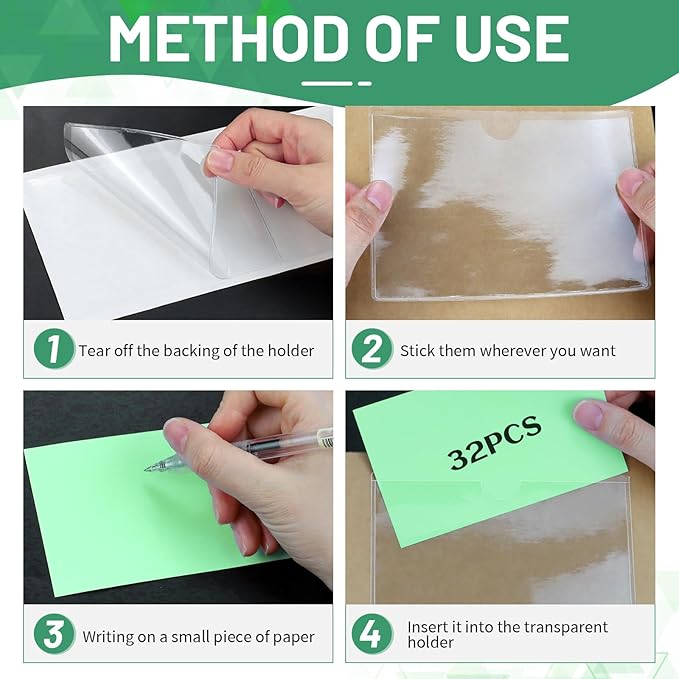 - Stay Organized: Place your cards, labels, nameplates or photos in the clear adhesive pocket and stick them wherever you need them for easy tagging or organizing. Adhesive label pockets against fingerprints, water, dust or dirt