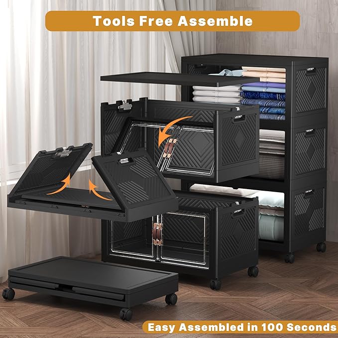 480Qt Stackable Storage Bins with Lids, 3 Pack Large Collapsible Bins with Wheels, Plastic Cabinet with Doors, Foldable Closet Organizers and Storage for Home, Dorm, Office, Black