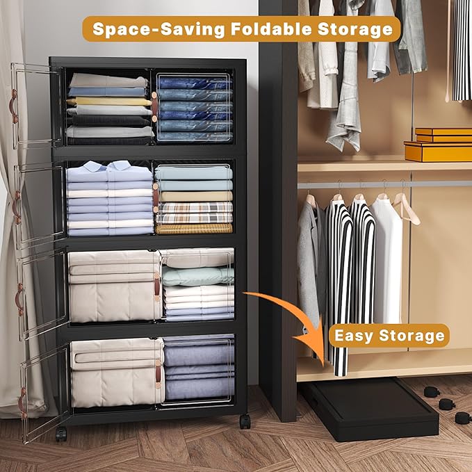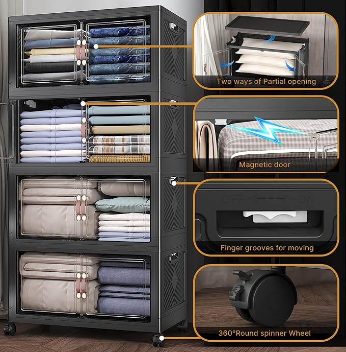 480Qt Stackable Storage Bins with Lids, 4 Pack Large Collapsible Bins with Wheels, Plastic Cabinet with Doors, Foldable Closet Organizers and Storage for Home, Dorm, Office, Black