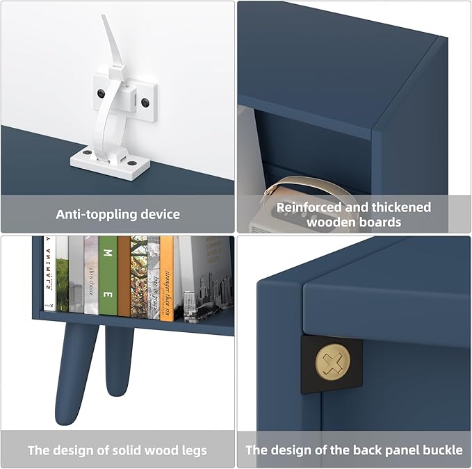 - 【 Reliable Materials Create Stable Structure 】 The durable 3 tier blue book shelf is made of sturdy high-quality wooden board with high glossy finish veneer. The angled wood legs of this vertical bookshelf have an upper surface wrapped in wood-grain paper and are supported by 5 metal screws for better stability.