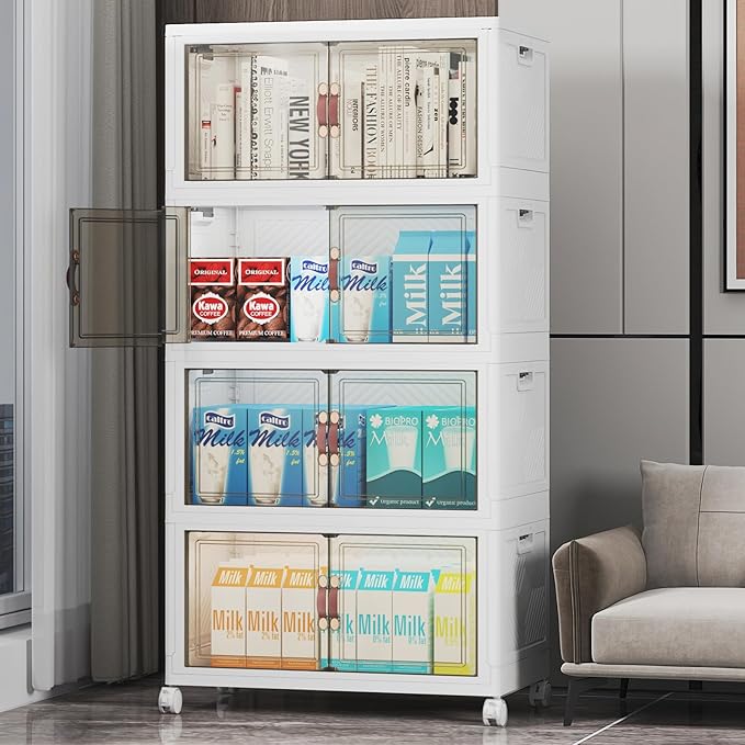 220Qt Stackable Storage Bins with Lids, 4 Pack Collapsible Storage Bins with Wheels, Plastic Cabinet with Doors, Foldable Closet Organizers for Home, Dorm, Office, White