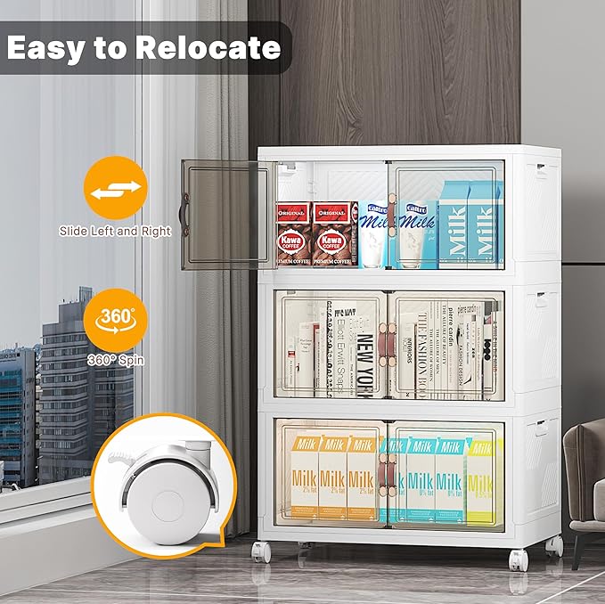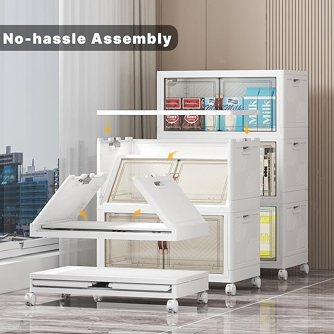 - 5. STABLE STACKING & SMOOTH ROLLING: Interlocking grooves + dual side locks keep bins firmly stacked (even tall piles). Equipped with 360° smooth-gliding wheels for flexible mobility.