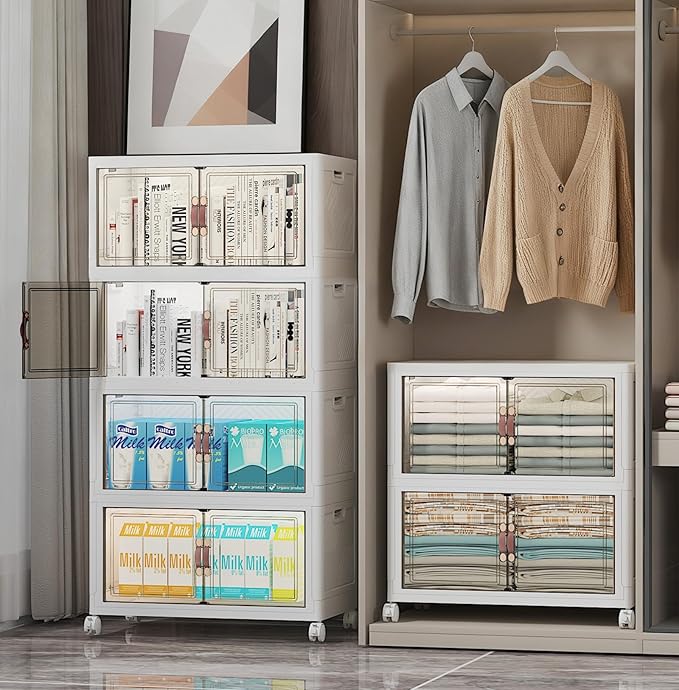 - 4. FRONT DOOR & TOP LID FOR EASY ACCESS: Front door for instant item retrieval; top lid for full coverage. No lifting or unstacking required. Note: these closet organizers come with 2 LIDS.
